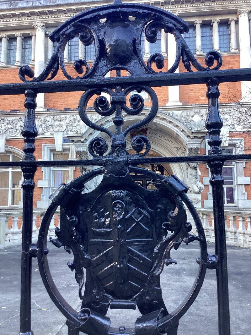 On the front of the Custom House Public Library in Prince Regent Lane. Two of the symbols on the shield link with the Silvertown area, The sailing ship top right is symbolises the docks. While the crossed hammers represent shipbuilding.