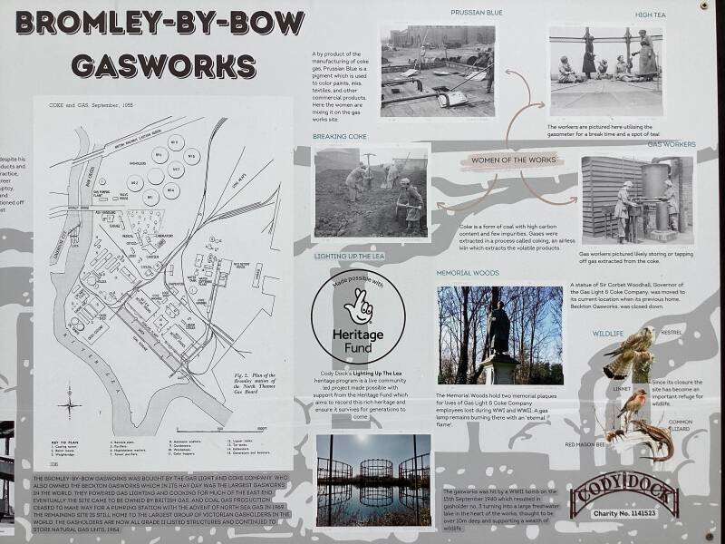 Cody Dock was a coal unloading point for the Bromley-by-Bow gasworks, receiving coal via smaller barges from larger ships involving massive coal handling for gas production, using cranes and conveyor systems.