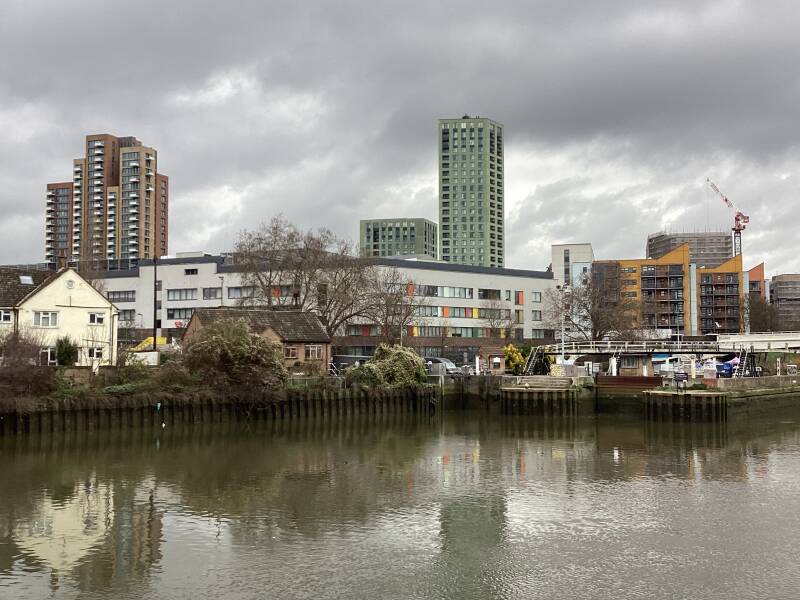 Over the Twelvetrees Bridge, and alongside the island area between river (right) and canal (left)